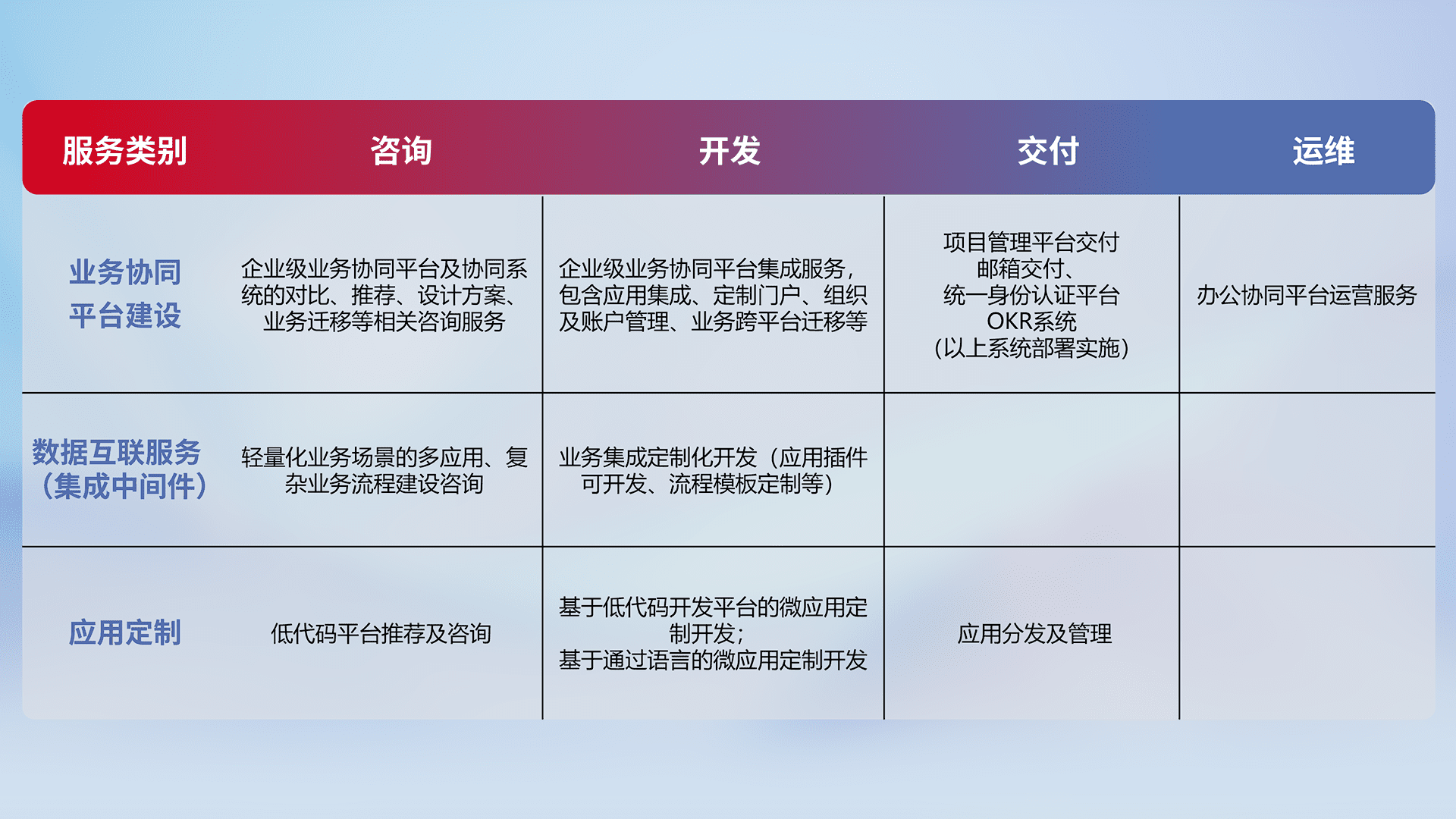 针对钉钉、、企微、、、、IDaas等平台级产品提供产品的规划、、、、方案、、、、交付、、、、定制化开发等服务,,,实现如统一协同办公、、智能客户服务、、混合会议管理、、智能数据查询、、、、等业务场景,,,实现数字化转型。。