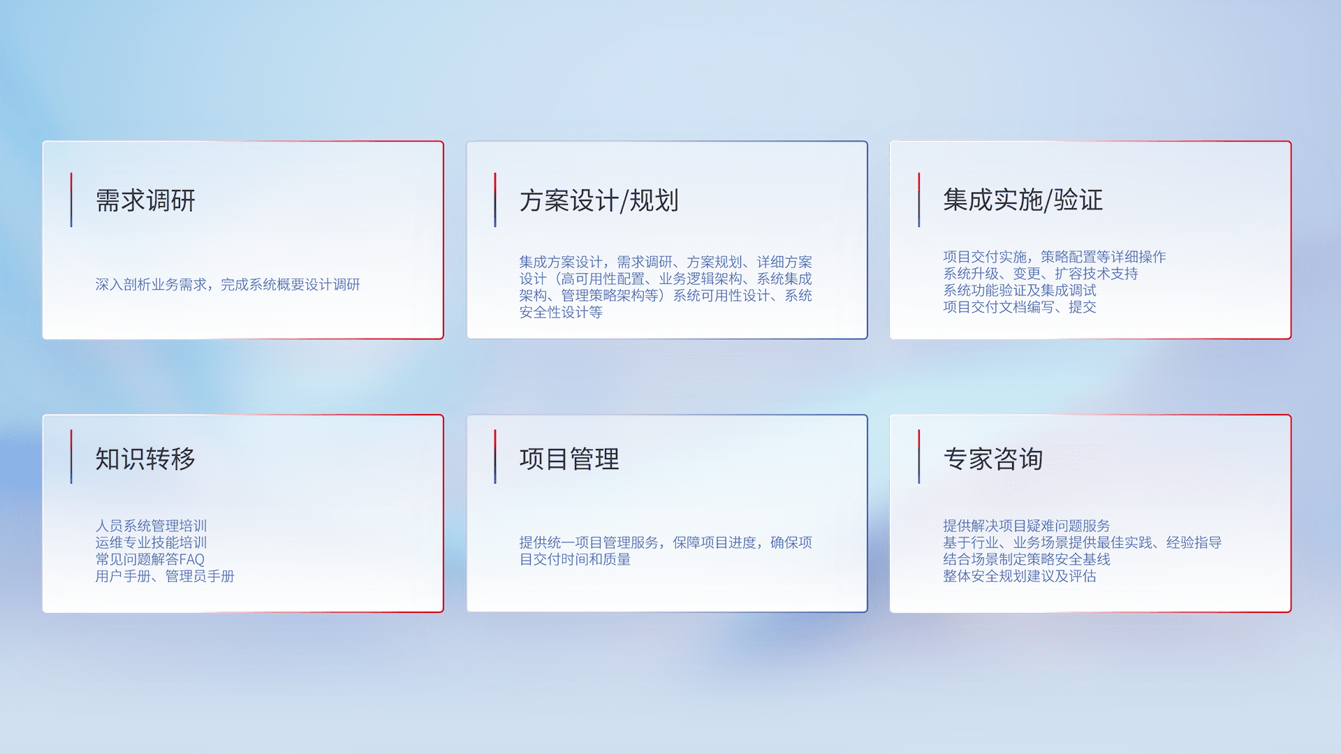 针对客户行业特性,,将宏观的安全战略和需求,,,通过专业的交付服务,,,,实现项目落地,,为客户提供标准规范的集成交付服务。。。